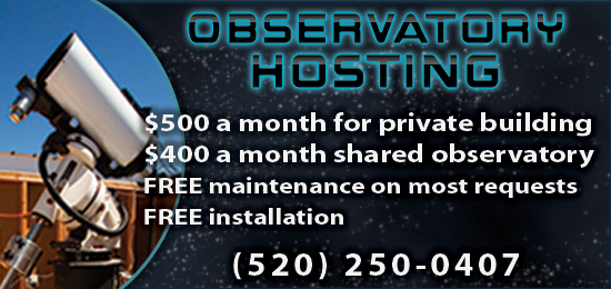 We offer low cost Observatory Hosting for your telescope setup to image the night sky from the dark skies in southeastern Arizona just east of Benson, AZ.